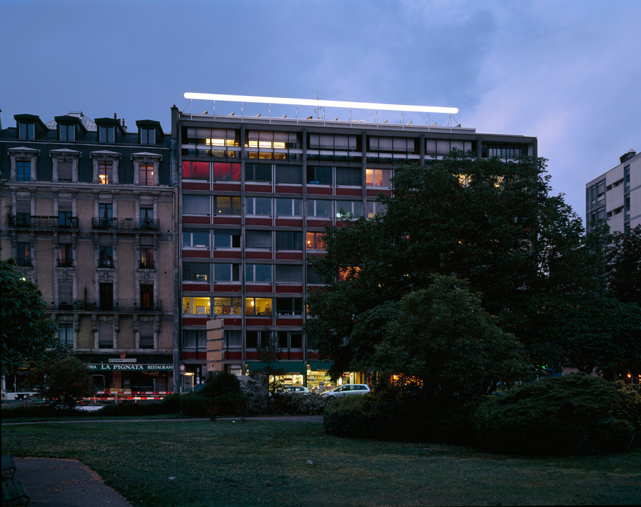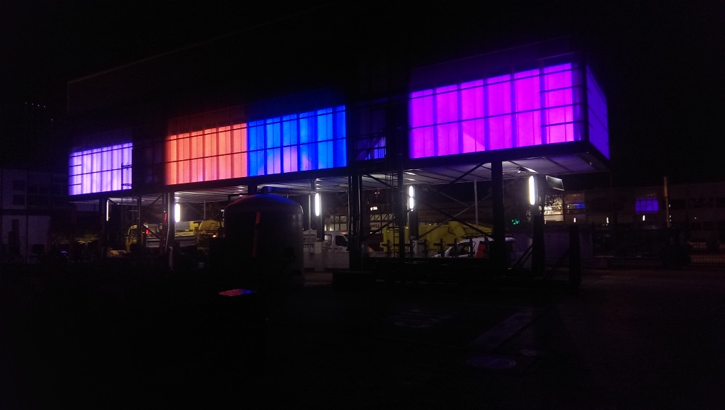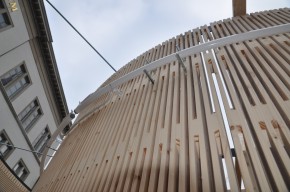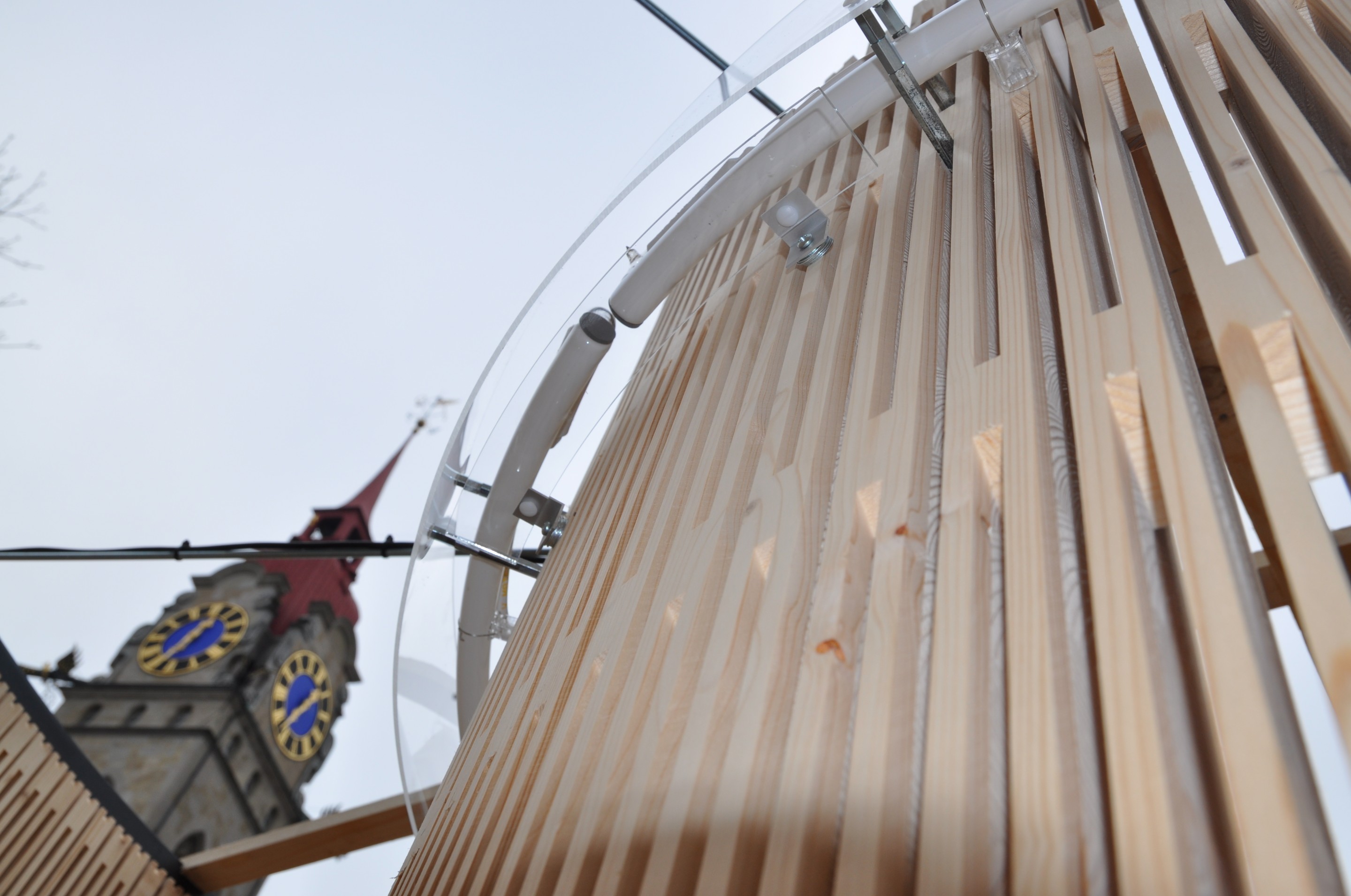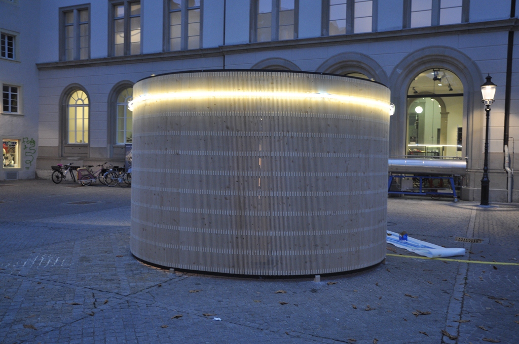 Der bekannte Architekt und Künstler Christopher T. Hunziker entwarf für die Ausstellung „Wood loop“ konzentrische Kreise mit einer effektvollen Neon-Konturbeleuchtung. Diese bildet eine Lichtaura im oberen Bereich ohne die obere Kante des Kunstwerks zu beeinträchtigen. Dabei wird das Ganze als Lichtkunst wahrgenommen. Auch die inneren Kreise sind mit Neon-Konturen bestückt was ebenso eine eindrückliche Lichtstimmung in Innern vermittelt.