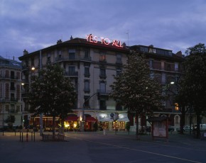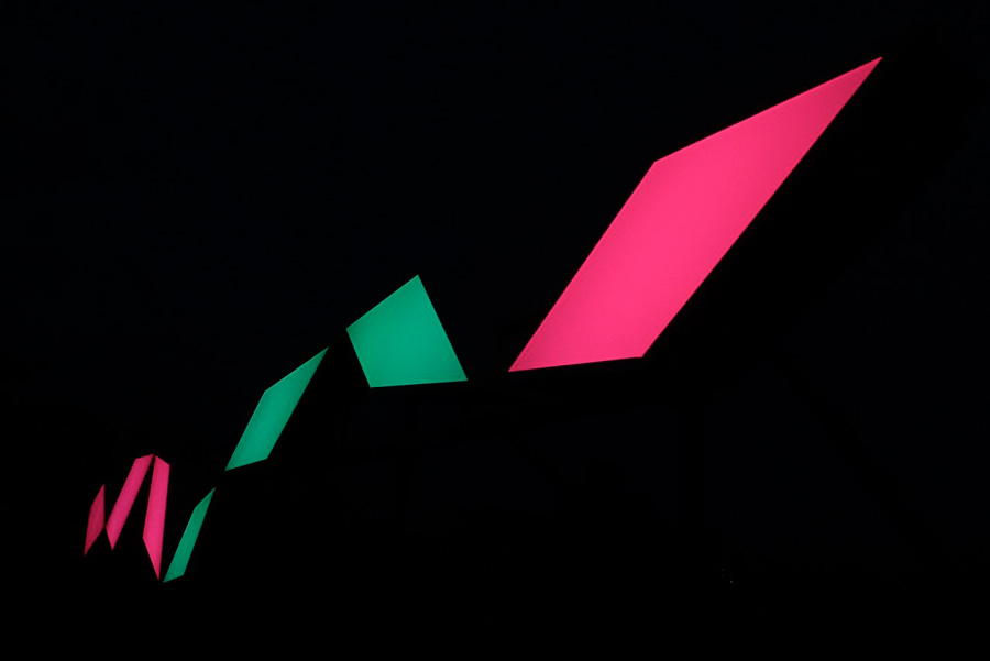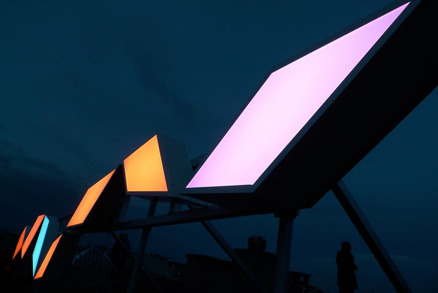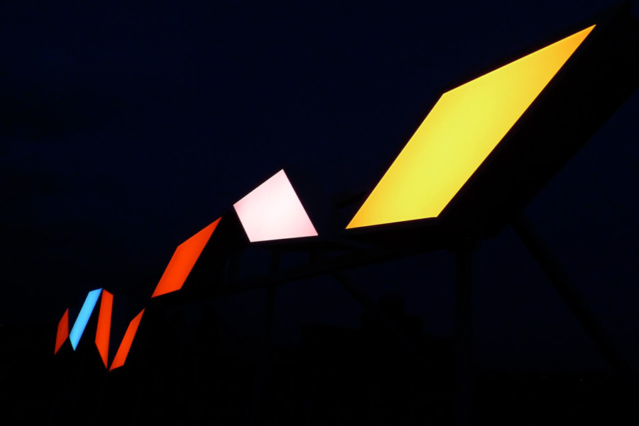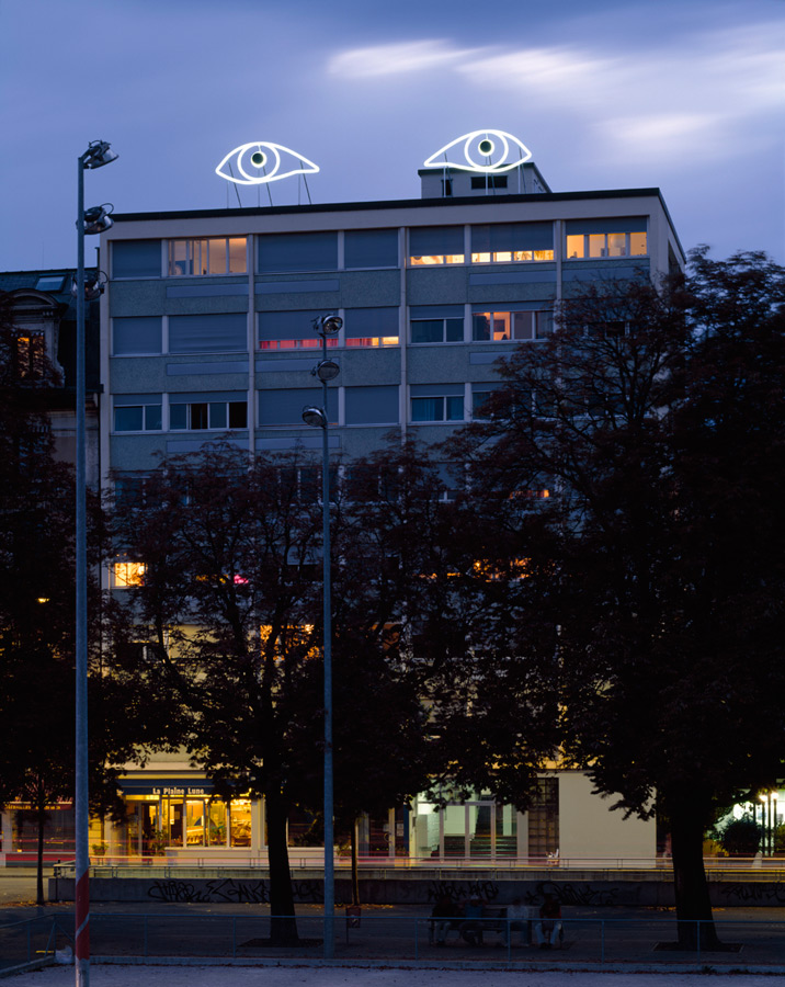 Das illuminiere Kunstwerk mit dem Gewerbemuseum im Hintergrund vermittelt eine impressionive Stimmung.